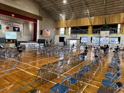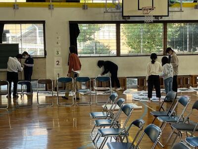 ・受付後は、昇降口にある靴箱又はブルーシートに外靴をおいてください。スリッパも若干用意はしていますが、ご持参いただきますと助かります。
