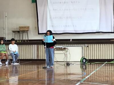 人権集会では、それぞれの学級で学んだことを発表しました。返しの言葉には「自分も友達のよいところを学んでいきたい」など、温かい言葉がたくさんありました。
