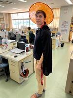 今日は、朝からこの格好で自転車に乗って、通勤してきたプルース先生!ほんとお茶目です!