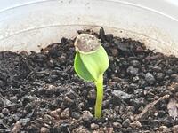 先日3年生が植えていたひまわりが芽を出していました。双葉が開く直前の状態で、まだ葉っぱの上には種の殻がくっついています。