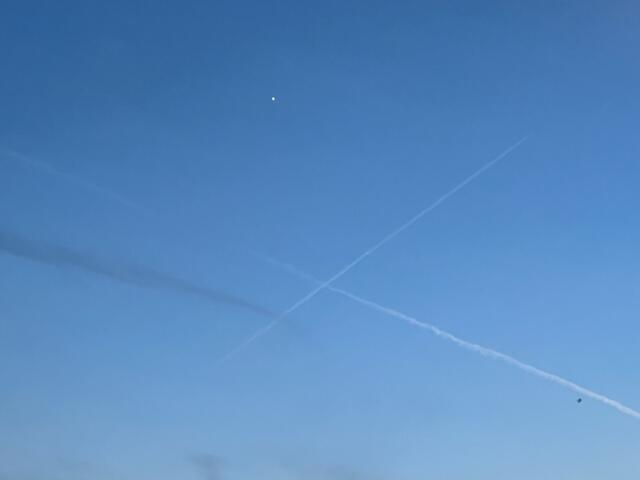 振替休日だった昨日の夕方でした。近所を散歩していて、ふと西の空を見上げると、飛行機雲が見えました。夕日が沈み、これから次第に空が暗くなり始める時間帯でしたが、はっきりとした白い筋の雲ができていました。よく見ると、もう一つの飛行機雲が逆方向からでき始めて、あっという間に2本の筋が交差したのでした。夕空に大きなクロスが作られ、その上の方には、光り輝く一番星(金星)も見えました。美しい光景に感動でした。