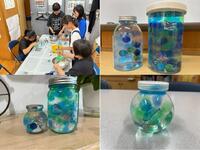 入ってみると、6年生が燃焼実験をしていたところでした。窒素、酸素、二酸化炭素の入ったビンの中でろうそくの炎がどれぐらい燃え続けるのか?