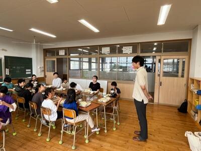 熊大の学生さんは、ガイドをしている子供たちから、その思いなどを楽しく給食を食べながらランチミーティング形式で…。