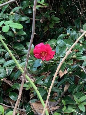 正門前にこんな花が一輪だけ咲いていました。「山茶花(さざんか)」のようです。よく似た花に「椿(つばき)」がありますが、椿はもう少し遅めに咲くそうで…。なかなか見分けがつかないのですが、花びらが一枚ずつ落ちていく山茶花に対して、椿は花全体が落ちてしまいます。葉っぱのギザギザが強いのも山茶花の特徴のようです。この花の他にもつぼみがたくさんありましたので、来週にはもっとたくさん咲いているかもしれません。