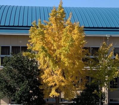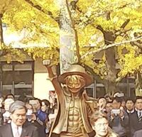 この写真は、校長室から撮影したものです。見事な黄金色に染まったイチョウの木が太陽の光を浴びて、輝いて見えます。他にも、赤く色づいたものも目立つようになってきました。そう言えば、昨年まで勤めていた熊本県庁のプロムナードには、多くのイチョウの木が植えられているのですが、今が見頃だとか…。当時の上司から県庁のイチョウ並木の写真をいただいていたので、ご紹介します。ここには、ルフィの銅像も設置されています。