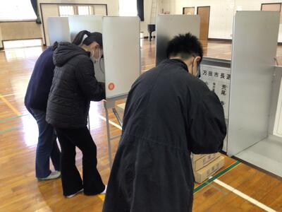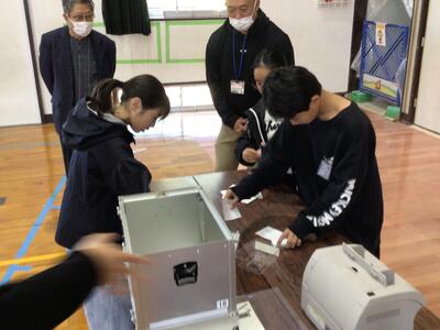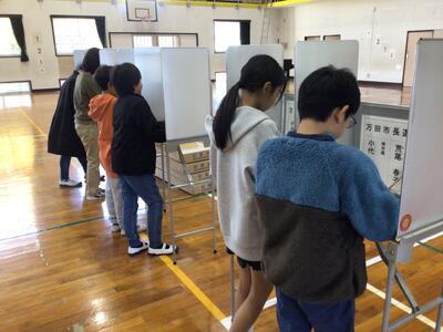 6年生が選挙についての出前講座を受けました。選挙とはどういうものなのか話を聞き、実際に選挙の体験をしました。選挙の体験では、立候補者の話を聞いたり、投票用紙に名前を書いて投票したりと、実際の選挙と近い形で体験をすることができました。