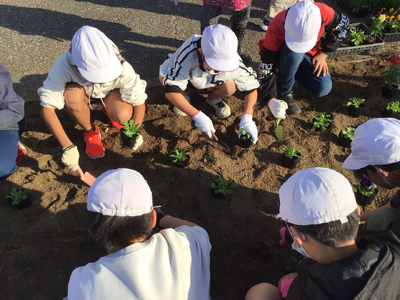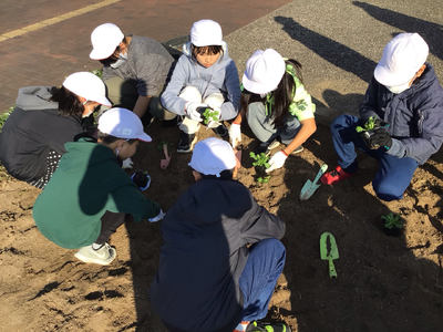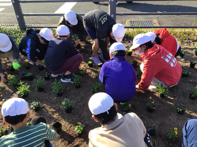 5年生が荒尾駅前の花壇に花を植えました。6年生から引き継いだ5年生は、初めての参加となります。初めての活動は、6年生が手入れをした花壇に花を植えました。心を込めて植えることができました。