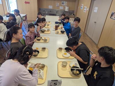 朝の集いの後は、朝ごはんです。2日目の活動に向けて、たくさん食べました。