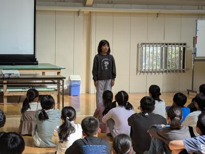人権集会では、それぞれの学級で学んだことを発表しました。返しの言葉には「自分も友達のよいところを学んでいきたい」など、温かい言葉がたくさんありました。