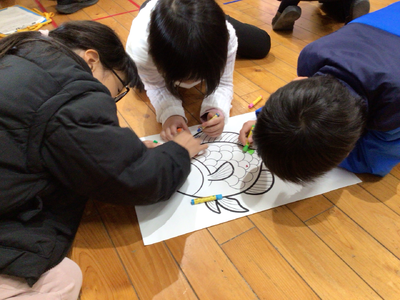 ひまわり学級で研究授業がありました。班ごとに声をかけあいながら1枚の絵に色塗りしていきました。一人二色しか使えないので、「ここに塗ってもいい?」「ここに塗ってね!」などの声掛けが大切です。班のみんなで声をかけあいながら、素敵な絵を完成することができました。