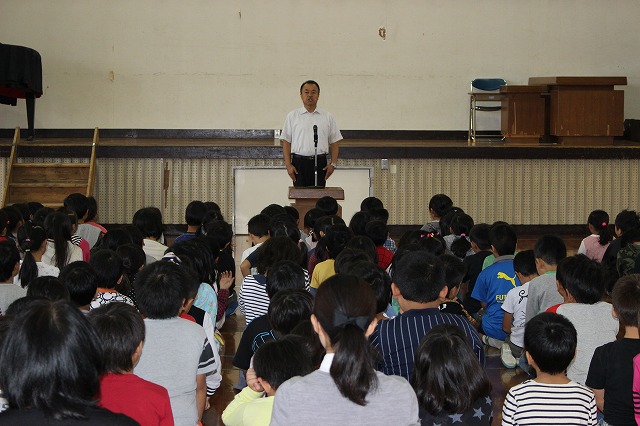 内容は、1~6年及び特別支援学級からの各代表1名による前期の反省発表、校長先生の話、校歌でした。