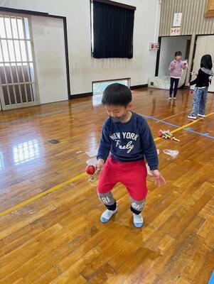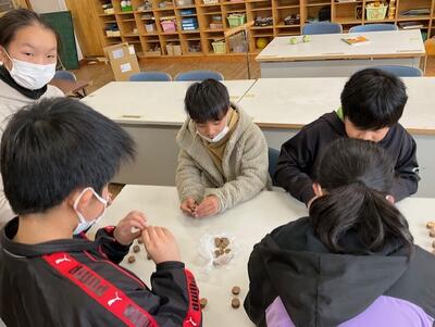 決められた時間内に、箸で大豆を取って、別の器に移していきました。箸の使い方が上手になりました。