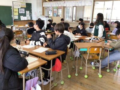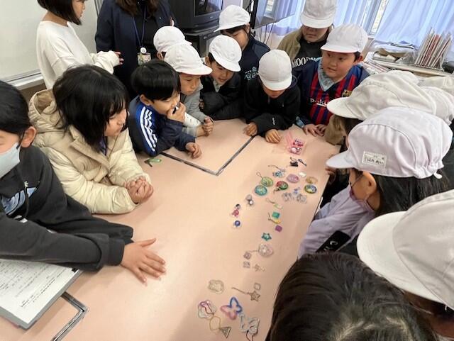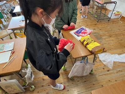 2年生が「うごくおもちゃ」をつくっています。同じ班の友達と力を合わせて、わいわいと盛り上がっていました。