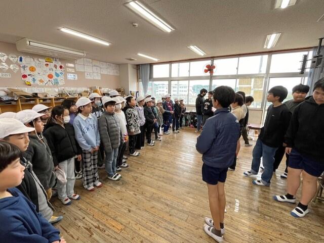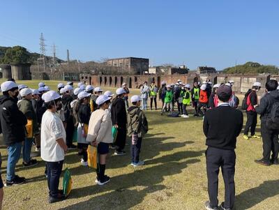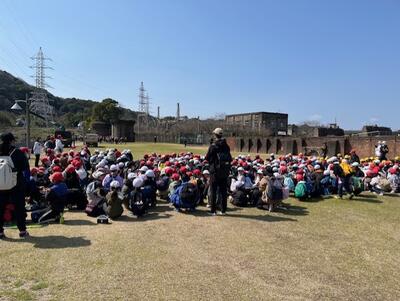 八幡小学校の6年生に向けて、6年1組が万田坑ガイドを行いました。