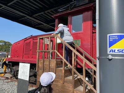 そこで、炭鉱電車保存会の方に来ていただき、万田坑や炭鉱電車について詳しく教えていただきました。