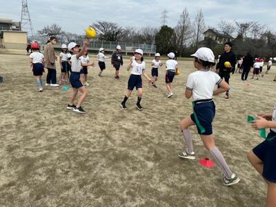 チームをつくり、9つの的に向かってボールを投げ込み、当たった的の数で勝敗を決めます。