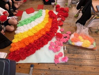 いろんな色の絵の具を混ぜながら、絵に色を塗っていました。素敵な絵がたくさんできています。