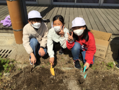 ボランティア委員会と児童会リーダーの子供たちが荒尾駅前の花壇に花を植えました。