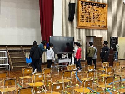 給食を食べ終わると、各委員長から、万田小学校の課題をもとに考えた取組の紹介をプレゼンしました。(来年、6年生になる5年生の子供たちも見学に来ていました!)