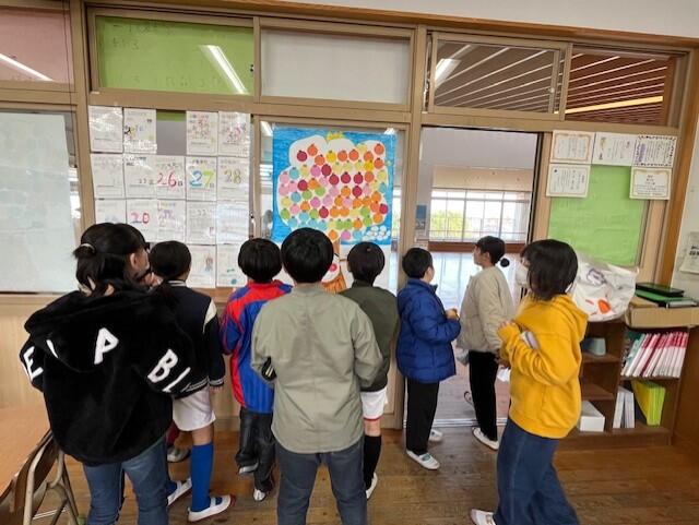 授業が終わった後も、4年生は5年生の教室を出ずに掲示物を見ながら憧れを抱いていました。