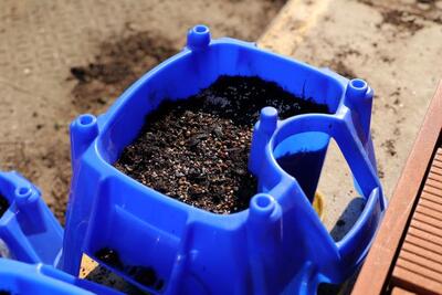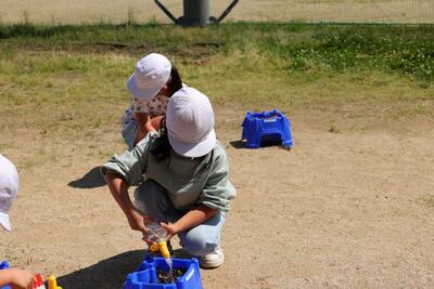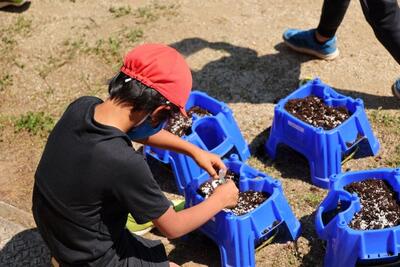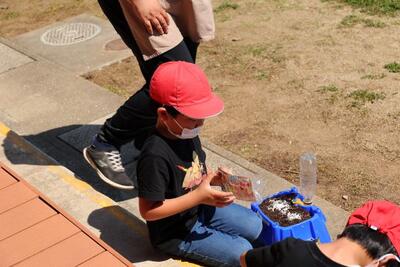 2年生が職員室前のテラスで植木鉢に何やら作業をしていました。