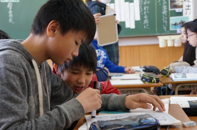 平成27年度国語TT福嶌先生研究授業 投稿日時 : 2016/02/23 学校サイト管理者 2月19日(金)第3校時に国語TTの福嶌先生が6年2組で研究授業を行いました。題材名は「海の命」で「漁師としての行き方新聞を書き交流しよう」という単元を貫く言語活動を設定し、本時では「なぜ、太一の考えは変わったのか」について焦点化して、一人学び、ペアトーク・グループトークで活発に意見交流をして学び合うことができました。構造的な板書により視覚的にも主人公の考えが変わったことについて学び合うことができるように工夫が図られていました。
