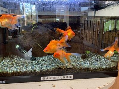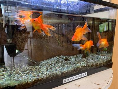 水槽内の5匹の金魚たちは、どんな会話を交わしているのでしょうね。見に来てください!