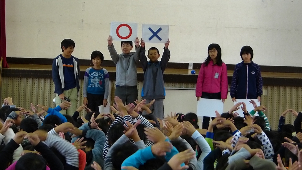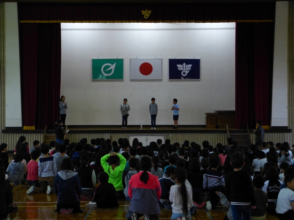 児童集会(栽培飼育委員会と体育委員会からのお願い) 投稿日時 : 2018/11/16 学校サイト管理者 カテゴリ:今日の出来事 児童集会(栽培飼育委員会と体育委員会からのお願い) 栽培飼育委員会からは、クイズ形式で、「花壇の花を大事にしてほしいこと」と「ウサギのえさやりで、気をつけること」という内容の説明がありました。 体育委員会からは、「運動場でしっかり遊びましょう」という内容の劇がありました。また、今度実施される「ニチレク」というニュースポーツについての説明がありました。単なる連絡ではなく、子どもたちが工夫して伝えているところが、とても良かったと思います。