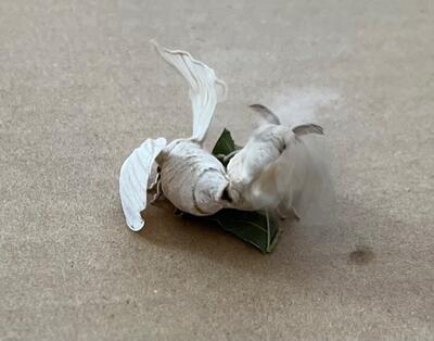 先日、ひまわり1組(4年生)の教室で、かいこを飼っていることをお知らせしましたが、ついにまゆを作り始めました。1匹は完全にまゆを作ったようです。