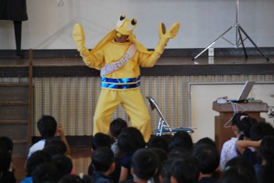 平成27年度フッ化物洗口(ぷくぷくうがい)説明会 投稿日時 : 2015/10/17 学校サイト管理者 10月16日(金)に11月から実施が始まる「フッ化物洗口の説明会」を行いました。まず、歯に関するお話をわかりやすくしていただいて、「歯を大切にしよう」という気持ちを高めることができました。そして、荒尾市のゆるキャラ「マジャッキーくん」の弟「マジッキーくん」が登場して、音楽に合わせて「ぷくぷくうがい」の仕方を教えていただきました。「8020」に向けて、日ごろのブラッシングとあわせて、子どもたちには、歯を大切にする習慣を身に着けてほしいと思います。最後に、歯科検診の後に治療が必要だとお知らせがあったご家庭で、まだお済みでないご家庭は、早めの治療をお願いします。