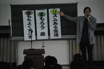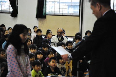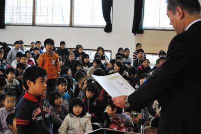 平成27年度冬休み前集会 投稿日時 : 2015/12/24 学校サイト管理者 12月24日(木)の朝の活動の時間に「冬休み前集会」を行いました。まず、校長先生から「安」という漢字にまつわるお話しをしていただきながらこの1年間をふり返り、来年は安全、安心に暮らせるようにがんばっていこうとお話をされました。また、お話の中で「安心してください。宿題はできていますよ。」と期待していることを話されると、児童は笑顔でうなづいていました。きっと、来年は宿題を頑張ってしてきてくれることと思います。その後、修学旅行での6年生の食事のときのマナーのすばらしさについて感動されたエピソードを話されました。そこで、「鍛える」という言葉を引用されて、「指導に応えられる6年生の素直な気持ち・態度」を「他の学年の児童の皆さんも見習ってほしいこと」、「先生たちも、きちんと指導すべきを工夫をしながら皆さんを鍛えるために努力をするので、児童の皆さんも素直な気持ちで自分自身のことを鍛えるためにいろいろなことに取り組んでいってほしい。」という旨のお話をされました。つづいて、冬休みの暮らし方について松本先生から、健康な過ごし方について小山先生からお話をしていただいていただきました。つづいて、表彰を行い、最後に校歌斉唱を行って終わりました。13日間の冬休みは、ご家族でのんびり、ゆっくりと過ごされて、楽しいものになることを心より願っています。そして、1月7日にみんなで元気に後期後半のスタートをできることを願っています。来年も、どうぞ、よろしくお願いいたします。