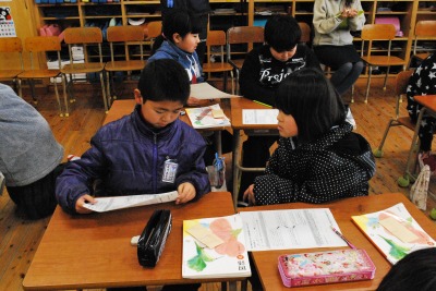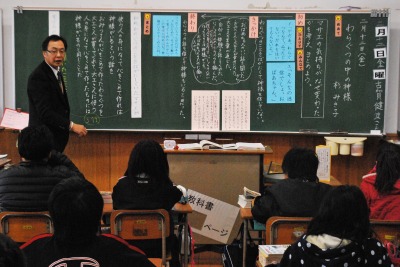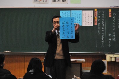 平成27年度5年2組溜渕先生研究授業 投稿日時 : 2016/02/12 学校サイト管理者 2月12日【金】第2校時5年2組溜渕先生が国語科「わらぐつの中の神様」の研究授業を行いました。主人公の気持ちが変わるきっかけを読み取ることに焦点化して、センテンスカードを並べ替えたりペアトークで共有化を図ったりしました。難しい内容でしたが、最後まで粘り強く学習に取組むことができました。