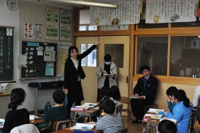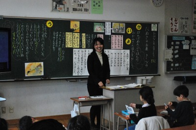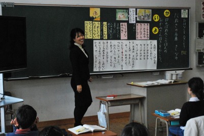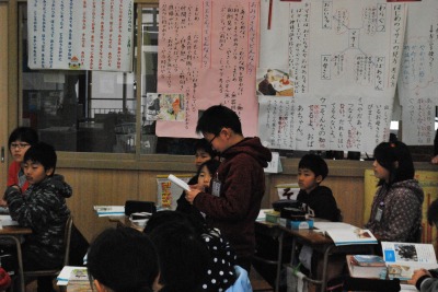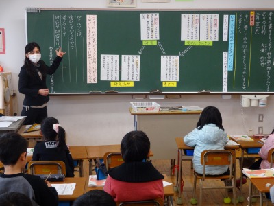 平成27年度1年3組紀伊先生研究授業 投稿日時 : 2016/02/05 学校サイト管理者 2月4日(木)第2校時に1年3組の紀伊先生が国語の研究授業を行いました。題材名は「たぬきの糸車」で、目標は、二の場面のたぬきの行動を見たおかみさんの日記を書いて、おかみさんの気持ちを想像することでした。あえて、まちがったおかみさんの日記を提示して、お話の中のおかみさんの気持ちにあった日記を書くためにはどうしたらよいかに焦点をあてて、意見交換をして共有化を図りました。大きな声で音読したり、友達の発表をしっかり聞いて、みんなで協力して学びあう姿がありました。