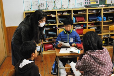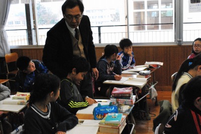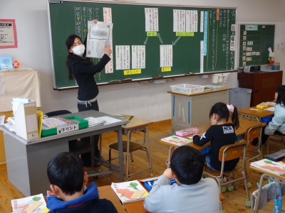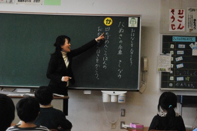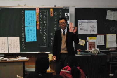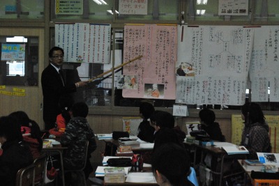平成27年度1年2組浅嶋先生研究授業 投稿日時 : 2016/02/15 学校サイト管理者 2月15日(月)第5校時に1年2組浅嶋先生が、玉名教育事務所の谷口アドバイザーを講師にお招きして、国語科の研究授業を行いました。題材は「たぬきの糸車」で「おかみさん日記」を書くことを単元を貫く言語活動にすえて、学習を積み重ねてきました。本時では、第四場面について「置き換え」というしかけで、教師が間違った日記を提示して、教科書と照らし合わせながら正しい叙述を出し合いました。あわせて、そのときのおかみさんの気持ちやたぬきの気持ちを出し合い共有化を図った後に、おかみさんになったつもりで「おかみさん日記」を書きました。「裏に書いてもいいですか。」という児童もたくさんいて、びっくりしました。児童は、意見交流を通して、おかみさんのたぬきに対する感謝の気持ちやうれしかった気持ちを共有することができました。最後に、そのようなおかみさんの気持ちを反映させたすばらしい音読で学習を仕上げることができました。谷口アドバイザーからは、指導案の修正・練り直しが授業にもよく生かされていたこと、学習活動を精選したことにより計画していた通りにチャイムで授業を終えることができてすばらしかったことなど、たくさんのお褒めのことばをいただきました。今後も、家庭での音読練習やたくさんの本にふれる機会を充実させることで、語彙力のアップにつなげてほしいという助言をいただきました。また、県学力調査の分析結果を活用して、H26・H27年度の2年にまたがって定着率の低い問題については、学校全体で、優先的に補充的な指導を徹底する必要があることもご指導いただきました。いただいた助言を生かして授業の改善と学力の確かな定着につなげていきます。