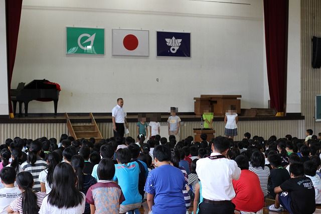 表彰、五人の転校生の紹介と校長先生の話、生徒指導担当の話、校歌斉唱です。