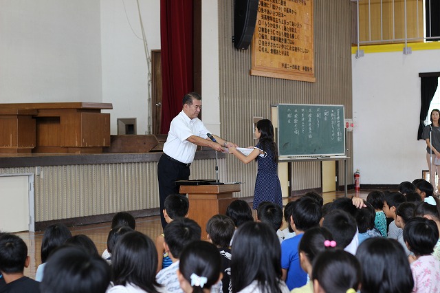 ↑ 8月17日の第55回玉名地方童話発表大会に出場した5年生児童1名の表彰です