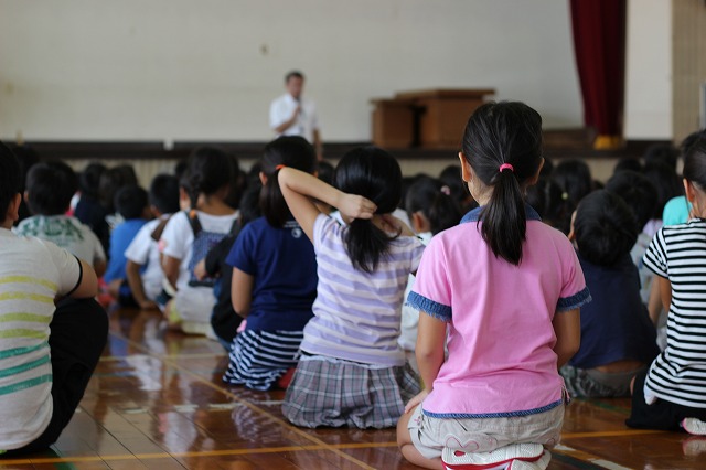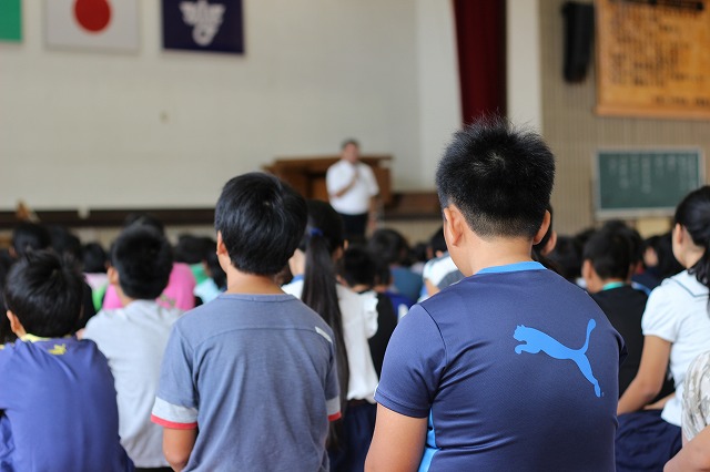 ↑ 校長先生は、パラリンピックや水泳で金メダルを取ると宣言した中学生の話から、「夢を持つ」「あきらめない心」「感謝」の三つを講話されました。