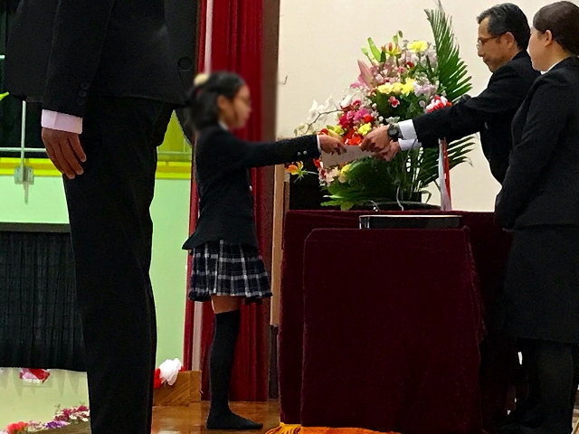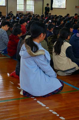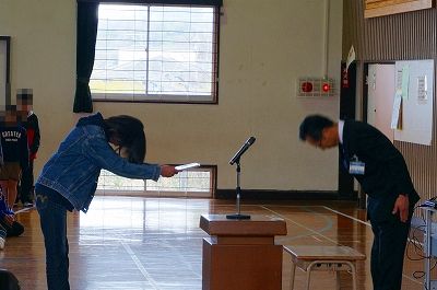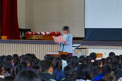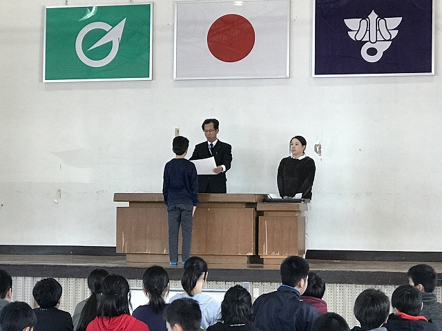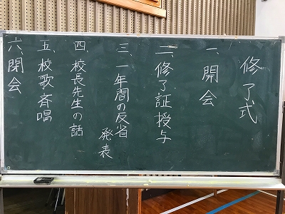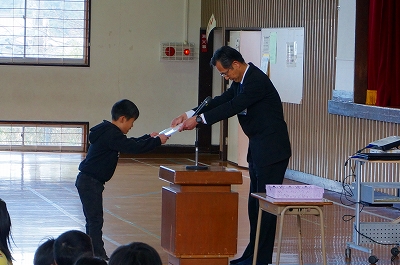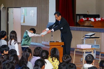 修了式① 投稿日時 : 2018/03/22 学校サイト管理者 カテゴリ:行事・特別活動 1限目に、全校児童参加の修了式をおこないました。1年間の締めくくりの行事なので、児童も緊張感をもちながら参加したようです。修了式の前に、エコキャップ収集活動や部活動、読書感想画、造形展の表彰をおこないました。修了式がはじまります。修了証授与です。次は、1年間の反省と来年度への抱負発表です。各学年の代表者が、全校児童の前で発表しました。--