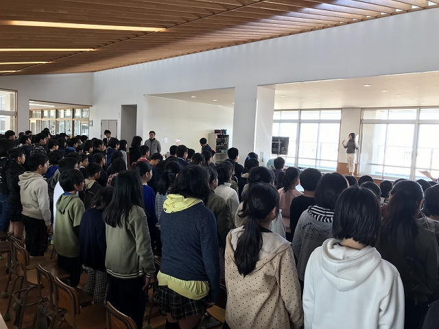 海陽中学校からの出前授業(6年生) 投稿日時 : 2018/03/16 学校サイト管理者 カテゴリ:今日の出来事 卒業をあと1週間に迎えた6年生を対象として、海陽中学校から英語担当の先生が来校され、2限目に6年1組を、3限目に6年2組に出前授業をしていただきました。今回の内容は、「アルファベットの読み方で単語を作ろう」というめあてでした。アルファベット2文字や3文字で表している「JR」や「AKB」などの単語を、グループごとに考えていきました。6年生のパワフルな雰囲気に海陽中の先生が圧倒されるかと思っていましたが、うまく受け流されていたのが流石でした。--