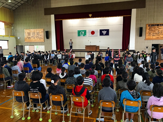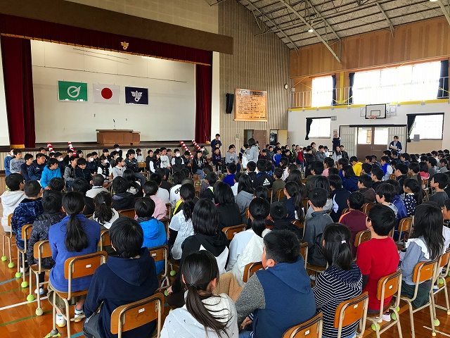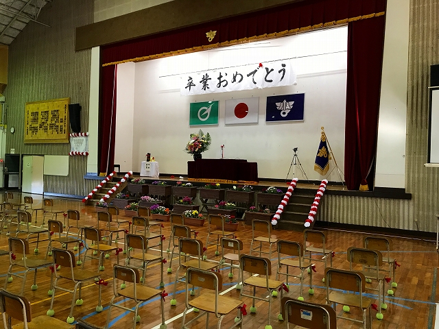 卒業式前 投稿日時 : 2018/03/23 学校サイト管理者 カテゴリ:行事・特別活動 本日は雨も上がり、晴天となりました。ただ、駐車場の地面が少しぬかるんでいるところもありますので、ご注意ください。なお、保護者の受付及び会場入場は9時からです。卒業式式場は、昨日、4・5年の在校生と職員で心をこめて準備をおこないました。すばらしい卒業式になりますように!!