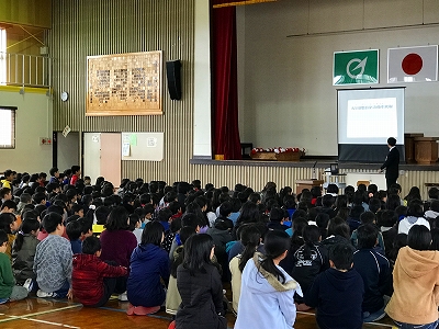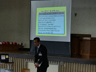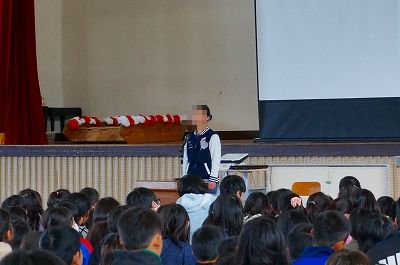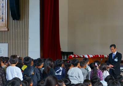 修了式② 投稿日時 : 2018/03/22 学校サイト管理者 カテゴリ:行事・特別活動 1年間の反省及び来年度の抱負発表のあとに、校長先生のお話がありました。↑ 児童もよい姿勢で、しっかりと校長先生のお話を聞いていました。 ↓↑ 生徒指導担当からは、春休みを安全にくらすために、3つの車(消防車・救急車・パトカー)を走らせないように自分の行動に気をつけてくださいと話がありました。↑ 養護教諭からは、早寝早起き朝ごはんをすることで、生活のリズムを乱さないでくださいと話がありました。--