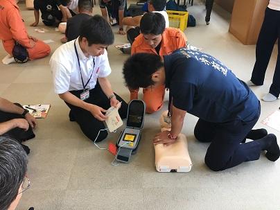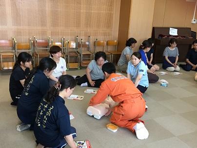 当日は、有明広域行政事務組合荒尾消防署から講師をお招きして、心臓マッサージやAEDの使い方について講習を受けました。
