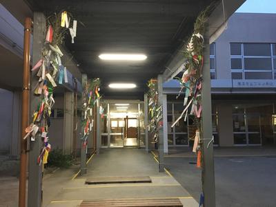 それを昇降口付近の渡り廊下に設置して、七夕通りの完成。