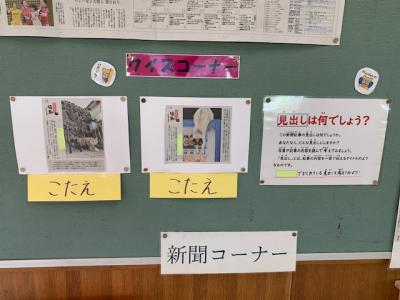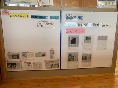 NIEとは、新聞を教材として活用する活動のことで、本校では数年前から取り組んでいます。朝活動だけでなく、自学でも取り組めるように図書室横のろうかにコーナーを設けているところです。