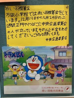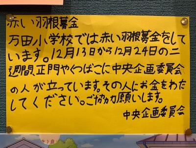 中央企画委員会は、毎朝児童玄関前に立って、赤い羽根募金の呼びかけを行っています。