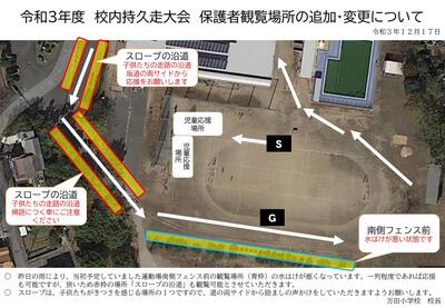 ただし、昨日(16日)の雨により、当初予定していた保護者の方々の観覧場所がぬかるんだ状態となっています。1列程度は応援も可能ですが、入りきれないため別添の図にあるように、スロープの沿道も観覧可能とさせていただきます。