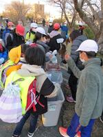 校内持久走大会の準備が運動場では行われる中、正門前にはたくさんのゴミが集められました。