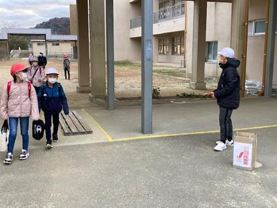 中央企画委員会は、毎朝児童玄関前に立って、赤い羽根募金の呼びかけを行っています。