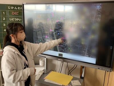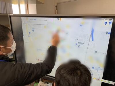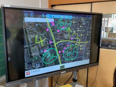先月行われた就学時健診の際に、新1年生の自宅場所を地図上に記録(場所と名前をグーグルマップ上に記録)していましたので、それぞれの地域児童会では、タブレットでそのデータを開き、電子黒板に映し出して、誰の家に近いのか?どの登校班だと人数も可能かといって検討をしていたのです。