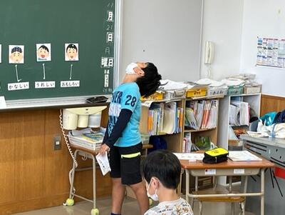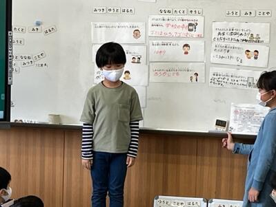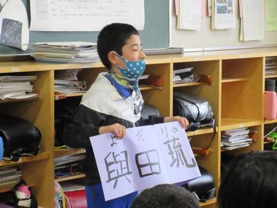 【お互いに自己紹介を行う6年2組の子供たちと與田くん】